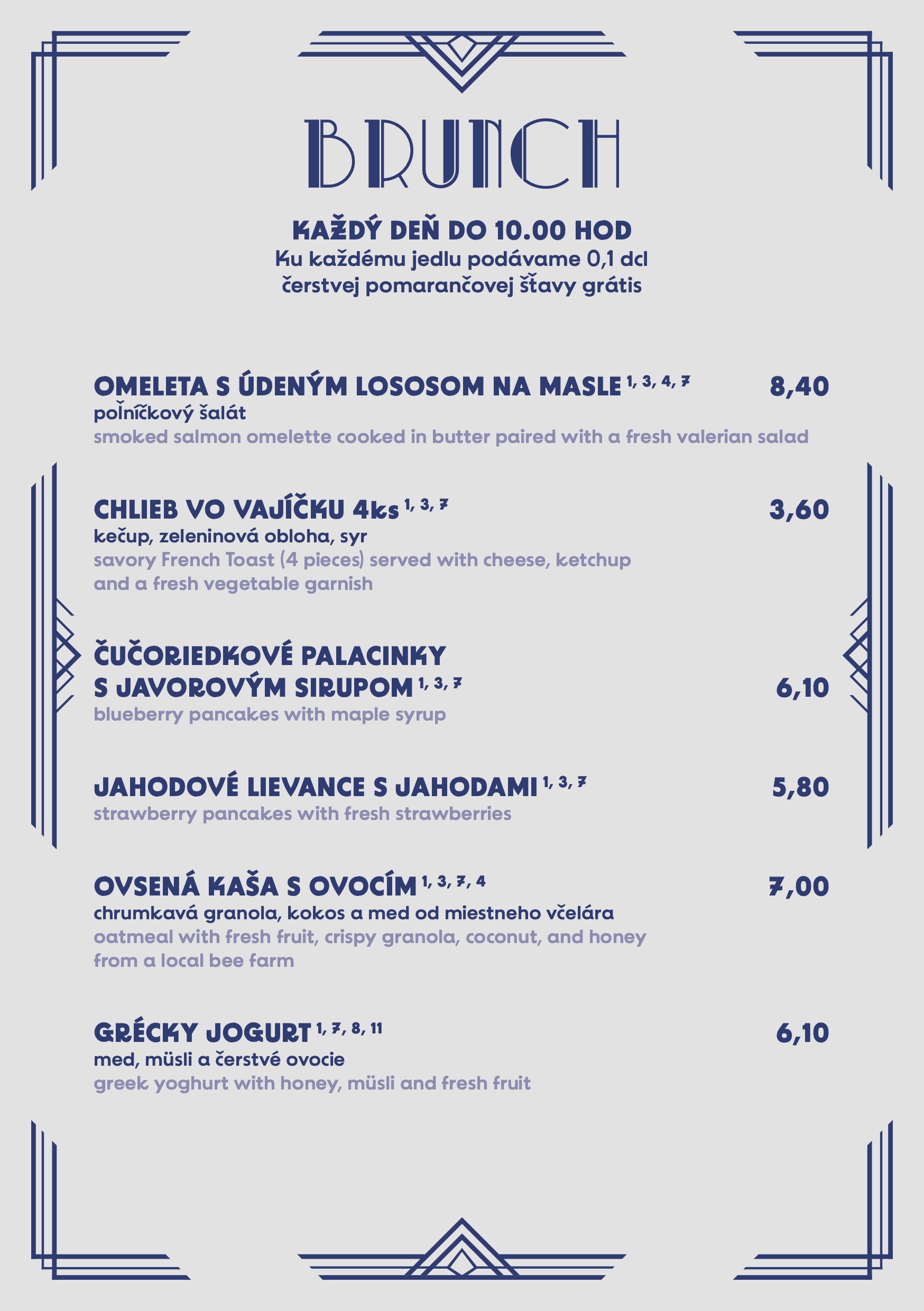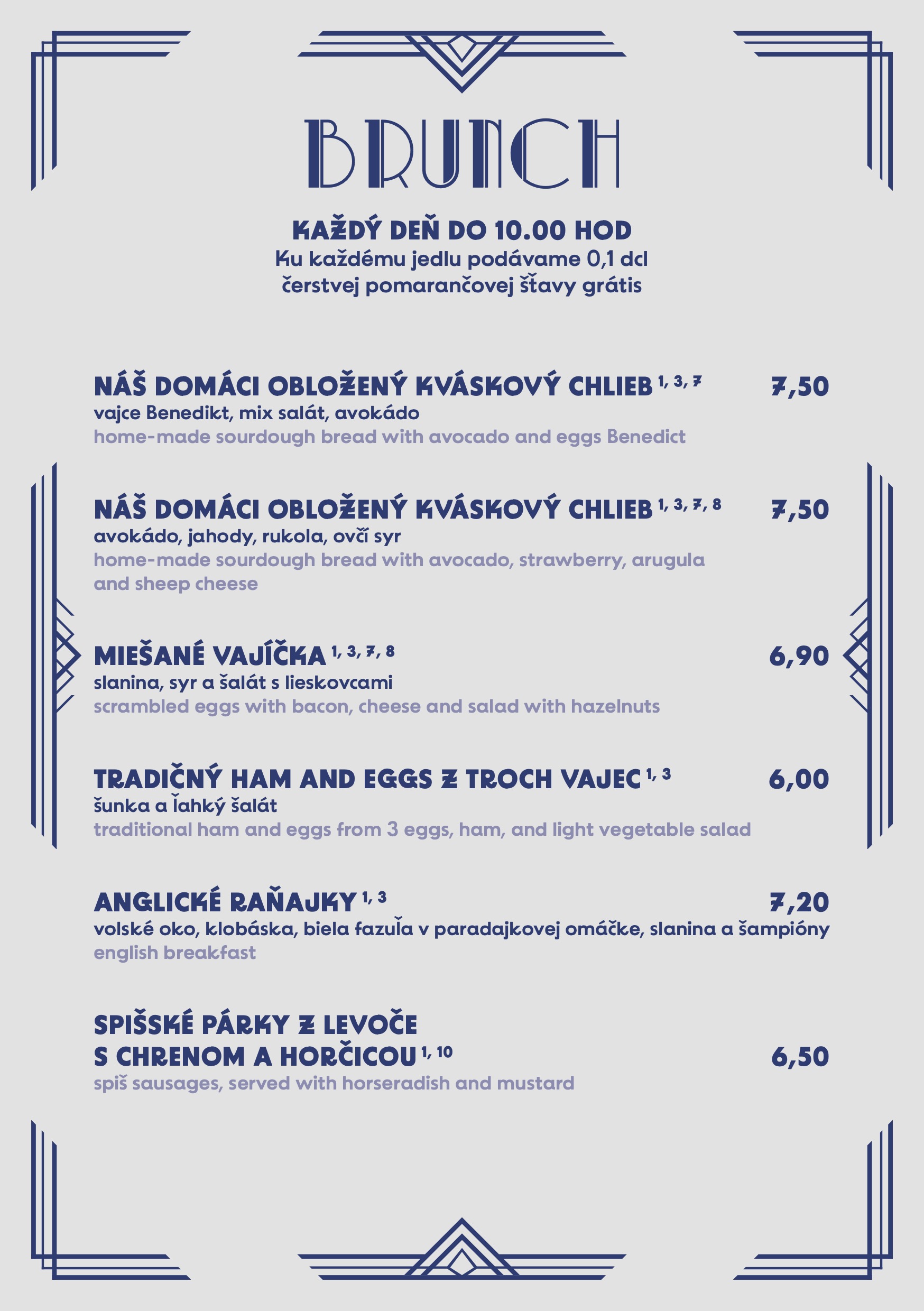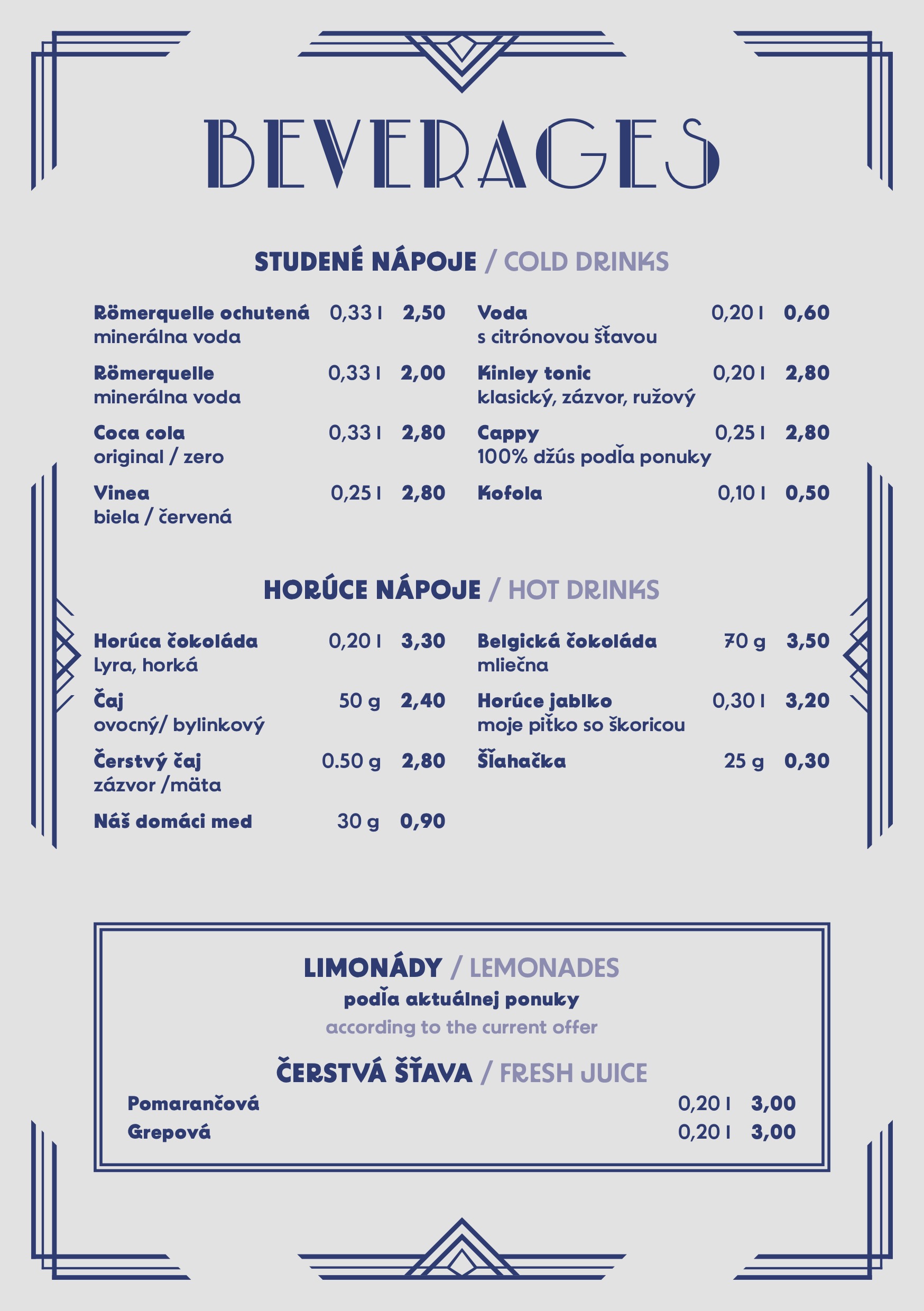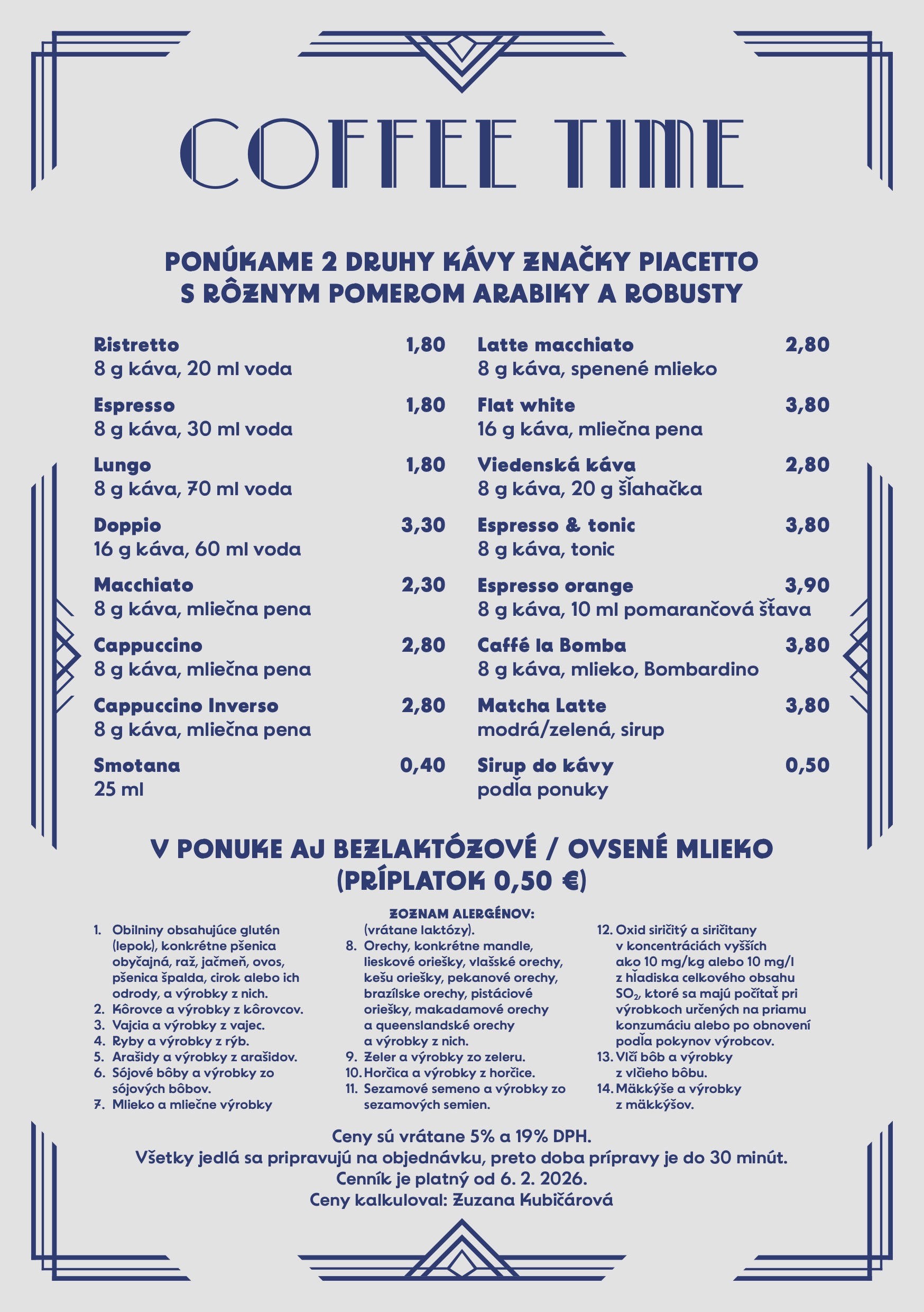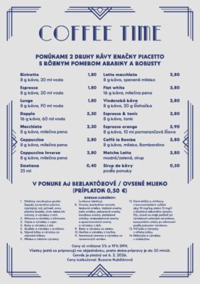 Vychutnajte si chvíle pohody s naším starostlivo zostaveným menu, kde nájdete raňajky, domáce koláče aj drobné jedlá z čerstvých surovín. Doprajte si šálku kvalitnej kávy v spojení s niečím dobrým pod zub a keď príde čas na oddych vo večernej atmosfére, siahnite po pohári vína, prosecca alebo niečom ostrejšom z našej ponuky spirit & wine & beer.